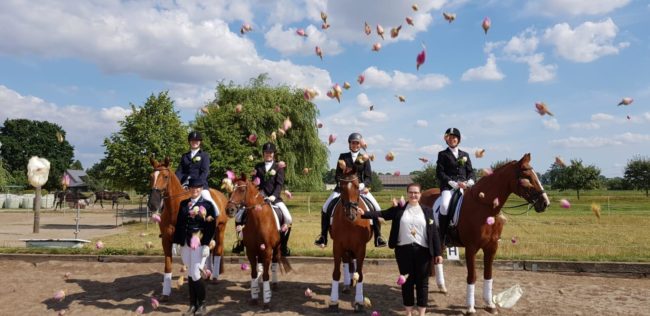 Vier Füchse aus unserem Stall waren heute auf einer Hochzeit bei der Allermöher Kirche zum Spalierstehen im Einsatz. Die Kirche ist nur wenige hundert Meter vom Stall entfernt und die Reiter konnten so gemütlich hinreiten.