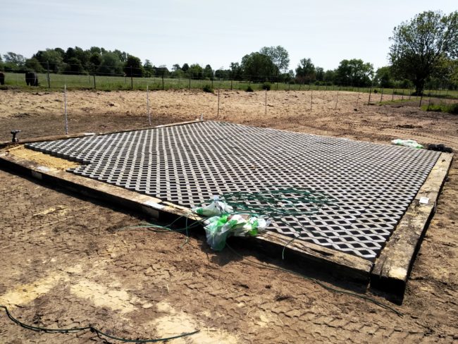 Die Boxenpferde haben nun ein befestigtes Podest auf ihren Sandpaddocks um die Heuraufen herum bekommen. Das Heu, das beim Fressen mal daneben fällt, kann so einfach beseitigt werden. Nach ein paar Tagen arbeit ist es nun geschafft!