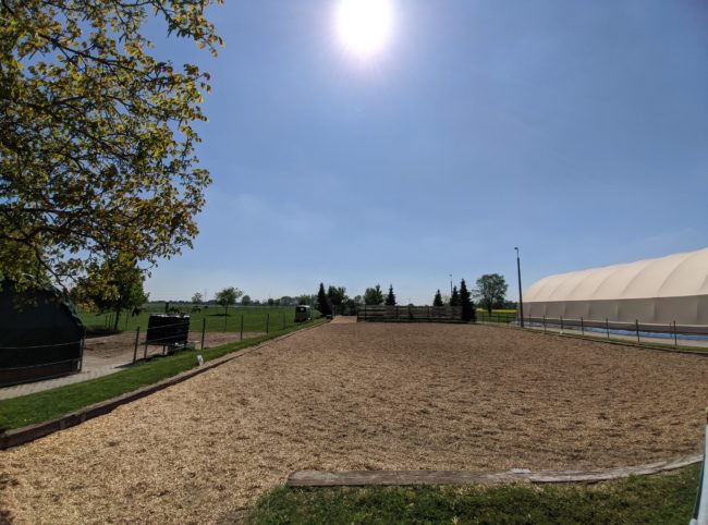 Passend zum Auftakt des Sommers wurde der Außenreitplatz wieder einmal mit neuen Hackschnitzeln versorgt, die erst gleichmäßig verteilt und dann in mehrstündiger Arbeit eingearbeitet wurden. Das Ergebnis ist ein wieder angenehm federnder Boden.